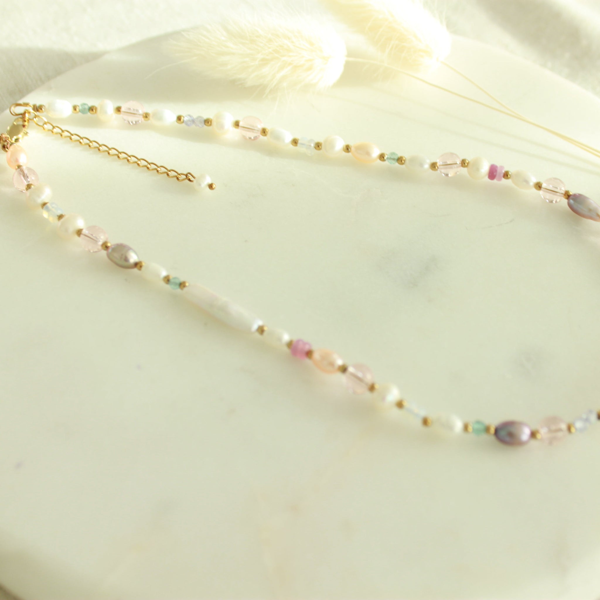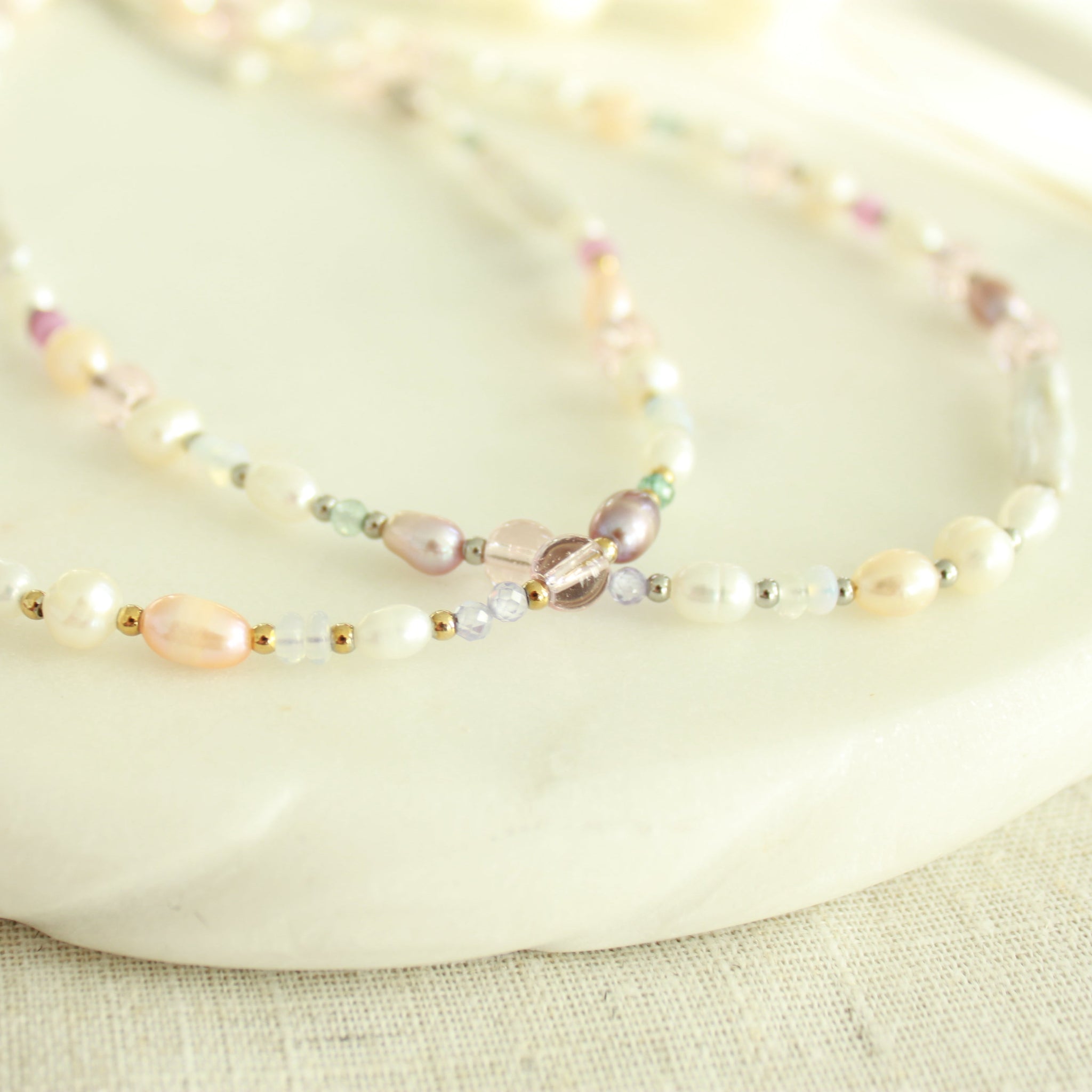 - Materials: A delightful colour mix of high-quality freshwater pearls and a variety of colourful gemstones, including frosted quartz, turquoise crystal, all beautifully strung together.