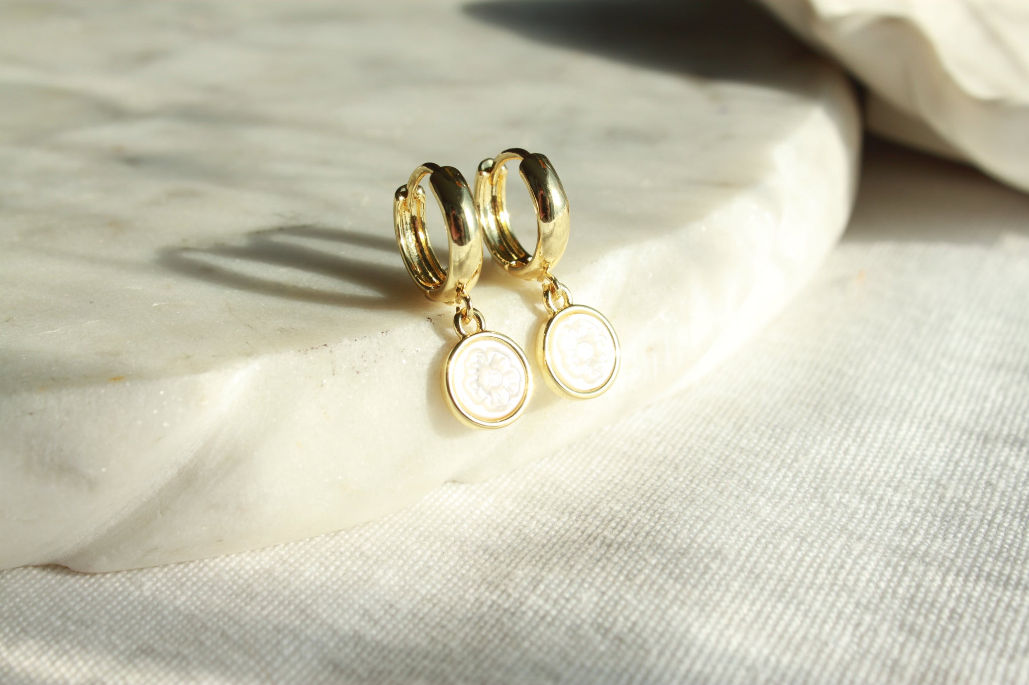 ✨ Elevate your jewelry collection with the enchanting Prairie Rose Etched Mother of Pearl Earrings today!