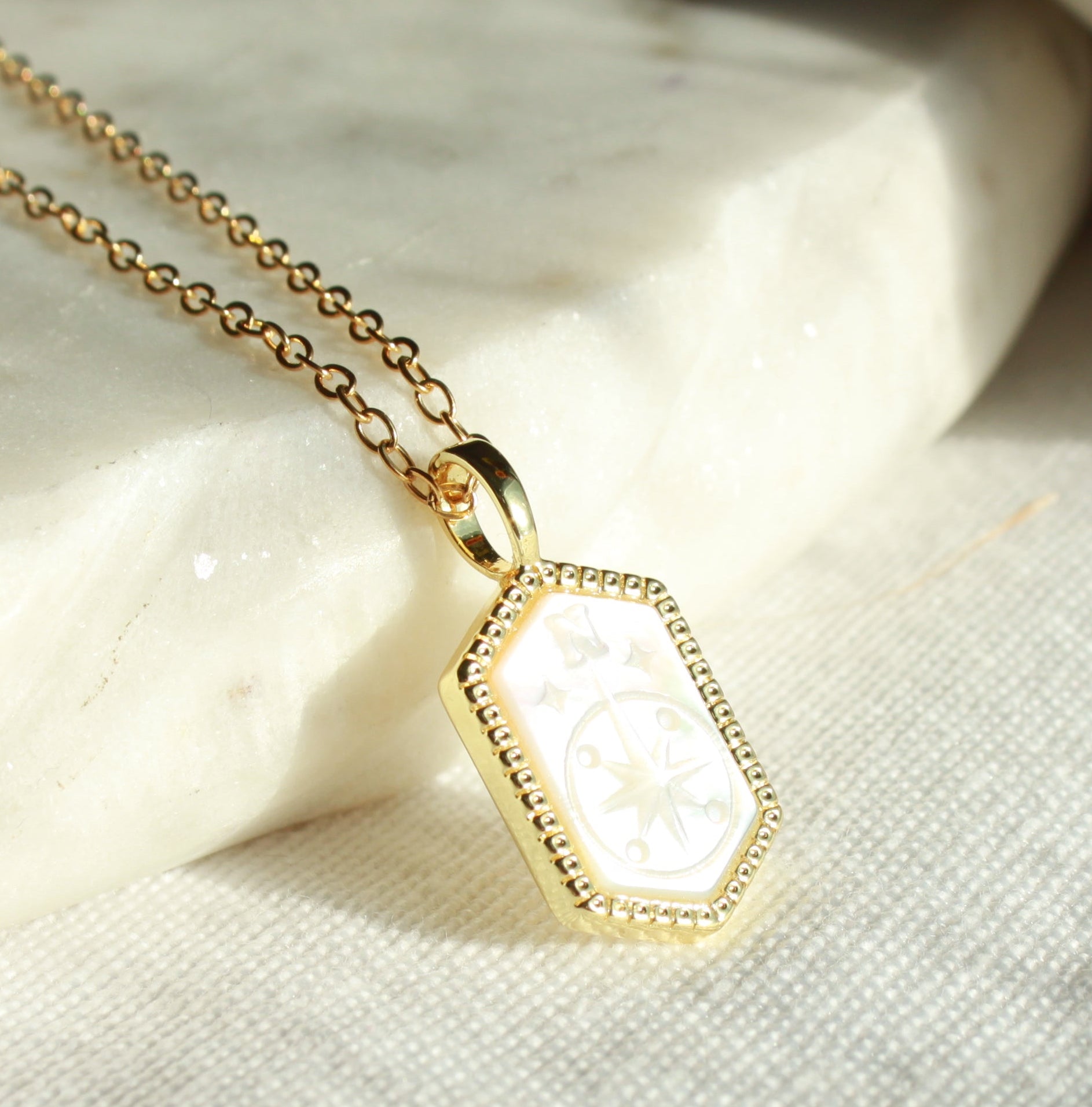 ✨ Add a touch of inspirational elegance to your jewelry collection with the True North Etched Mother of Pearl Necklace today!