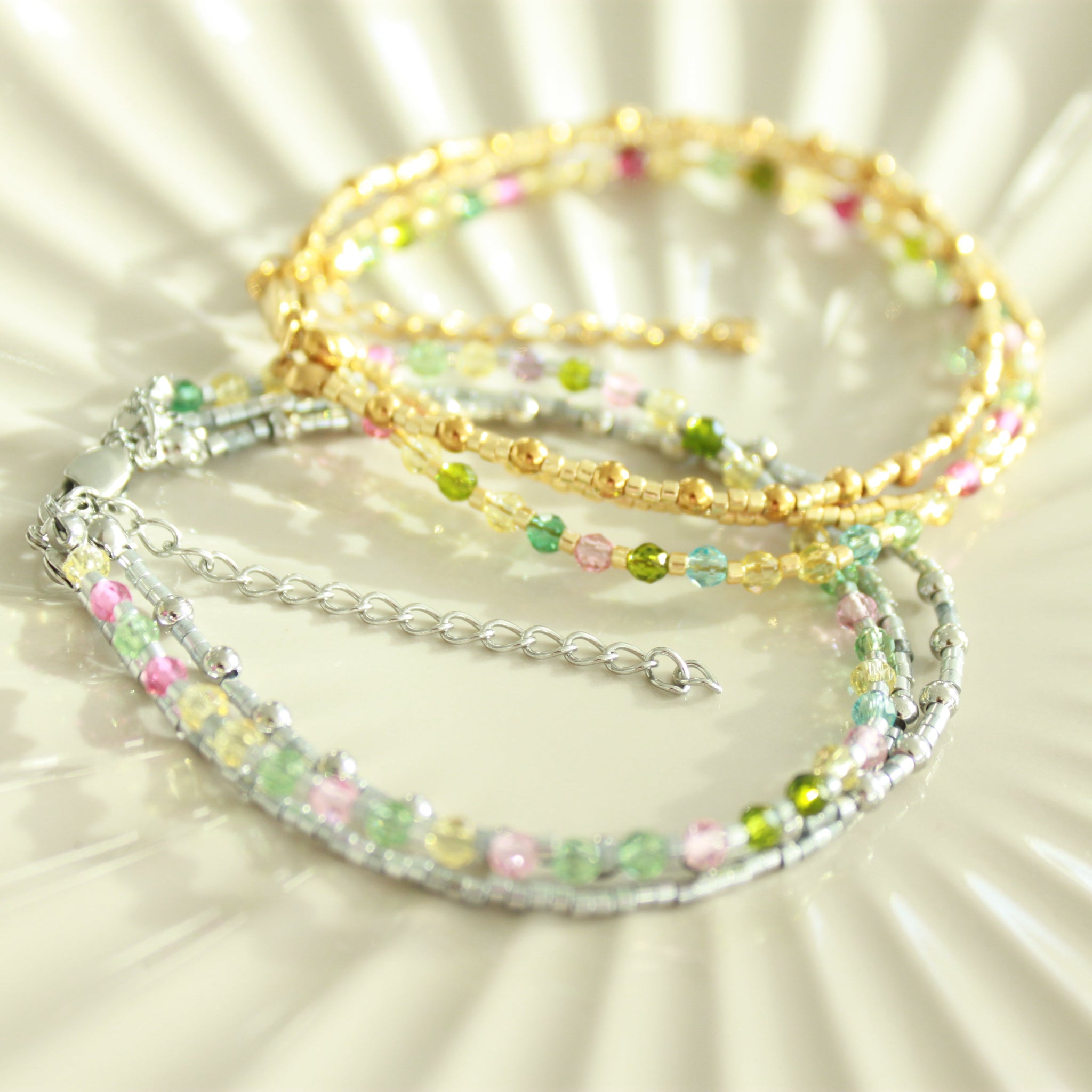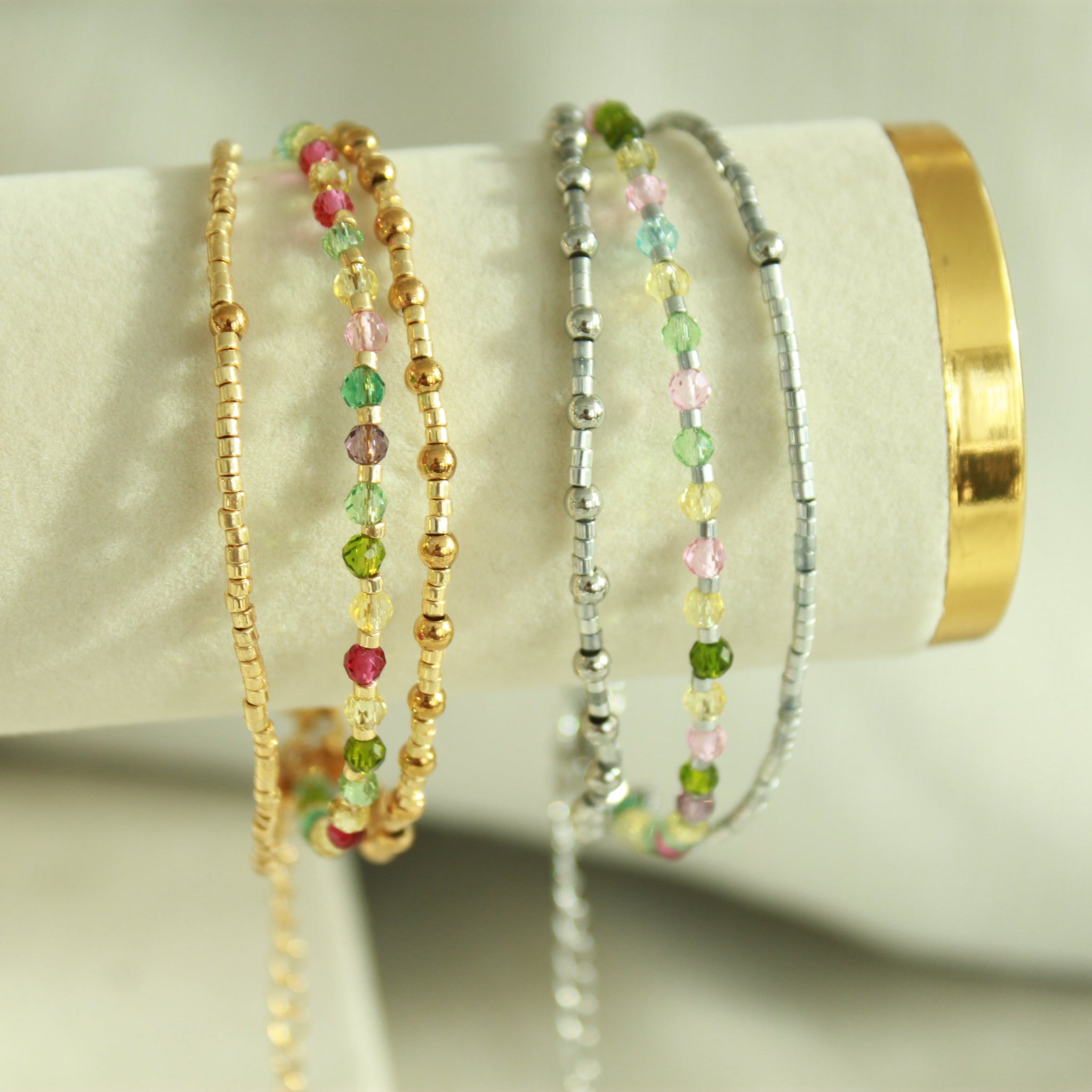 Introducing the Whimsy Triple Strand Bracelet, a delightful accessory that adds a touch of joy to any day! This stunning bracelet features three delicate strands that intertwine beautifully, allowing each strand to dance independently on your wrist, creating a whimsical yet elegant look.